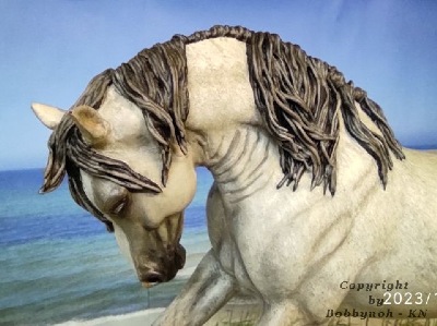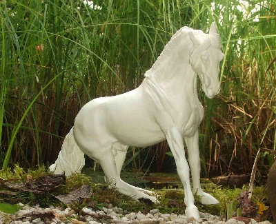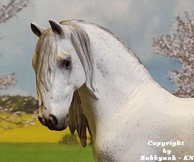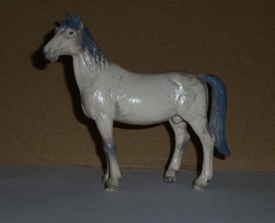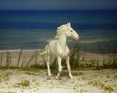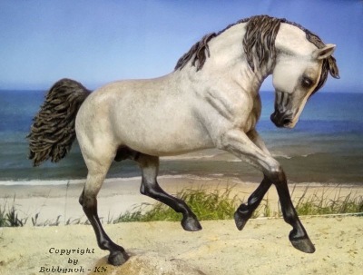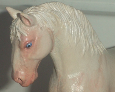das Ausgangsmodell von Ghost ist die CollectA Achal Tekkiner Stute, bei ihr habe ich die Mähne neu modelliert und sie dann zu einem Cremello bemalt